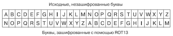 ROT13 - простой алгоритм шифрования, используемый на многих форумах (например, Reddit) для защиты от спойлеров или скрытия смысла дискуссии от новичков. Дешифровка алгоритма ROT13 проста - злоумышленник может взломать ваш код с помощью вероятностного анализа распределения букв в зашифрованном тексте, даже не зная, на сколько позиций сдвинуты символы. Никогда не следует использовать этот алгоритм для настоящего шифрования сообщений! Тем не менее существует немало приложений алгоритма ROT13: