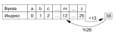 Во-первых, мы находим индекс символа c в алфавите abc. Во-вторых, сдвигаем этот индекс, прибавляя целое число 13 к индексу символа c в алфавите abc, с учетом нашего приема с модулем 26 (как пояснялось в предыдущих абзацах).