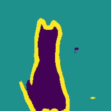 from tensorflow.keras.utils import array_to_img model = keras.models.load_model("oxford_segmentation.keras") test_image = val_input_imgs[i] # Исходное изображение plt.axis("off") plt.imshow(array_to_img(test_image)) mask = model.predict(np.expand_dims(test_image, 0))[0] # Утилита для вывода прогноза модели def display_mask(pred): mask = np.argmax(pred, axis=-1) mask *= 127 plt.axis("off") plt.imshow(mask) display_mask(mask)