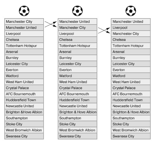 Рассмотрим следующую задачу: английская Премьер-лига состоит из 20 футбольных команд, каждая из которых может занимать по итогам сезона одно из 20 мест в рейтинге. При фиксированном количестве в 20 команд можно вычислить, сколько существует возможных вариантов рейтинга. Обратите внимание, что вопрос не в том, сколько мест в рейтинге может занять одна команда (разумеется, ответ на этот вопрос - 20), а сколько вообще существует рейтингов всех команд. На рисунке 1 показаны всего лишь три возможных рейтинга.