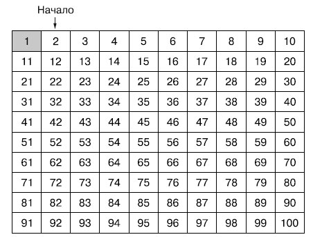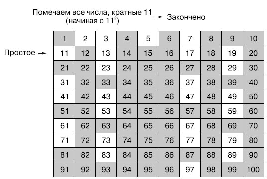 Переходим к следующему непомеченному числу, 11 (которое тоже простое). Помечаем все числа, кратные 11. Мы должны начать с числа 11 × 11 = 121, но понимаем, что оно превышает наш максимум m = 100. Так что алгоритм завершается. Все оставшиеся непомеченными числа не делятся ни на какое число, а значит, являются простыми.