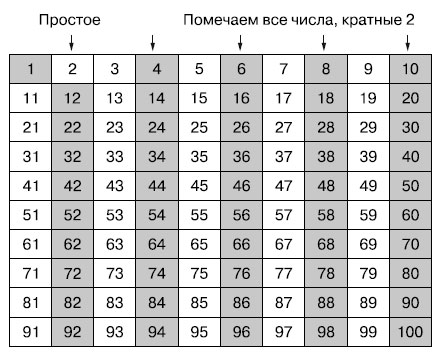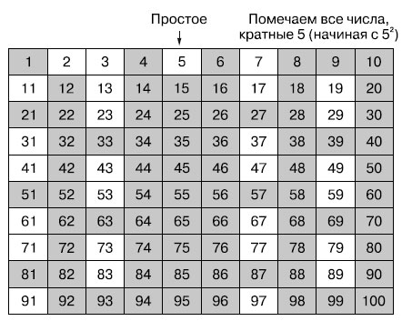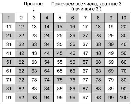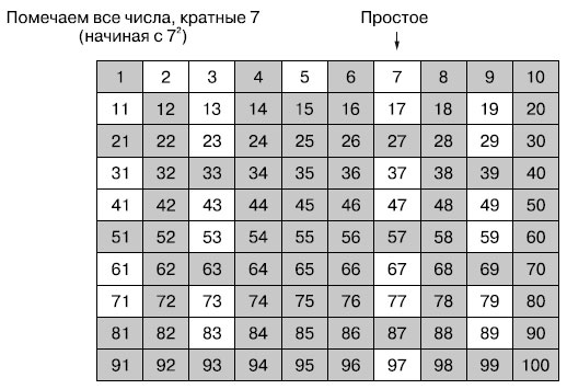 обнаружили простое число 7 и начали помечать с числа 7 × 7 = 49. Дело в том, что все остальные кратные числа (7 × 2, 7 × 3, 7 × 4, 7 × 5, 7 × 6)