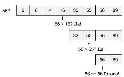 Например, представьте, что нужно найти в отсортированной последовательности значение 56. При "наивном" алгоритме мы бы начали с первого элемента списка, проверили, не равен ли он 56, и перешли к следующему, и так до тех пор, пока не проверили бы все элементы или нашли искомое значение. В наихудшем случае алгоритм проверяет все элементы списка. Отсортированный список из 10 000 значений требует примерно 10 000 операций для проверки всех элементов списка на равенство искомому значению. На языке теории алгоритмов можно сказать, что сложность вычисления линейна относительно количества элементов списка. Алгоритм не использует всю доступную информацию, чтобы добиться максимальной эффективности.